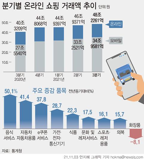 올해 3분기 온라인쇼핑 거래액이 48조원을 넘어서면서 역대 최대치를 기록했다. 지난 7월 코로나19 4차 확산이 시작되면서 음식 배달 등 온라인을 활용한 거래가 늘어난 것으로 풀이된다.