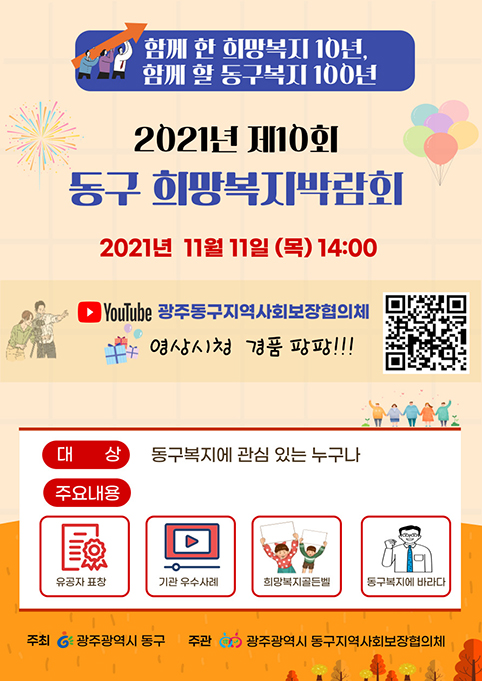 광주 동구는 오는 11일 구청 6층 대회의실에서 ‘함께 한 희망복지 10년, 함께 할 동구복지 100년’을 주제로 한 ‘제10회 희망복지박람회’를 개최한다고 밝혔다.