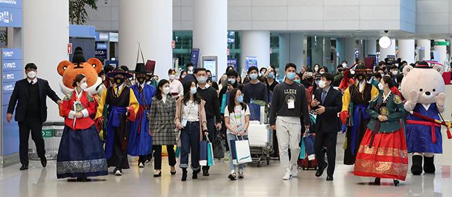 15일 오전 인천국제공항 제2여객터미널을 통해 싱가포르 관광업계 및 미디어 팸투어단이 입국하고 있다. 이들은 이날부터 한국-싱가포르간 여행안전권역(Vaccinated Travel Lane) 시행에 따라 입국한 관광객들로 코로나19 이후 국내를 찾은 첫 외국인 관광객이다. 2021.11.15.