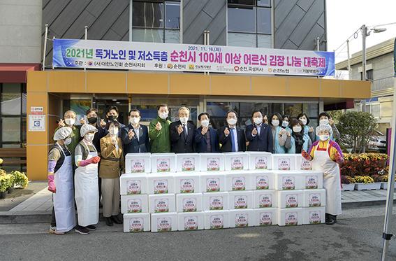 이번 나눔 행사는 관내 저소득 어르신과 함께 정을 나누기 위한 봉사활동으로, 순천시 노인회에서 순천시와 국민건강보험공단, 순천 농협, 거붕백병원의 후원을 받아 자원봉사자 50명이 배추, 무 등 김치 2000kg을 담갔다.