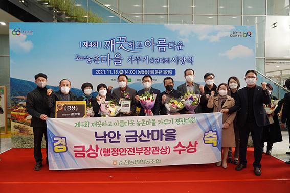 농협중앙회에서 주관한 ‘제4회 깨끗하고 아름다운 농촌마을 가꾸기 경진대회’에서 순천시 낙안면 금산마을이 금상(행정안정부 장관상)과 부상으로 2천만원을 수상했다.