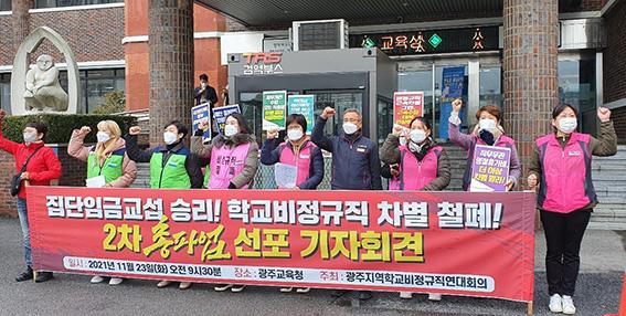 광주지역 학교비정규직연대회의는 23일 "교육감은 비정규직 차별 해소를 위한 직접교섭에 나서라"고 촉구했다.