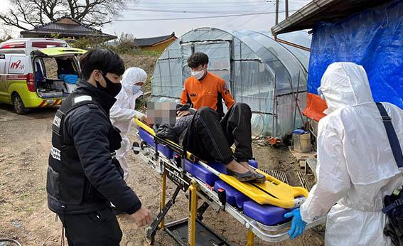 지난 24일 오전 10시께 전남소방본부 119생활안전순찰대가 영광군 묘량면에서 비닐하우스 화재로 정신을 잃고 쓰러져 있던 80대 노인을 구조하고 있따. (사진=전남소방 제공)