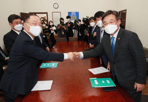 민주당 윤호중 원내대표와 홍남기 경제부총리 겸 기획재정부 장관은 이날 국회에서 당정 예산안 협의를 가졌지만 양측의 입장차만 재확인했다.
