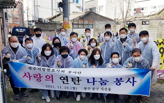 광주지방변호사회는 수년 전부터 지산1동 돌봄 이웃들을 위해 연탄 나눔 봉사를 실천해 오고 있다. 올해도 변호사회 회원 20여 명은 지산1동 행정복지센터 직원들과 직접 연탄을 배달하며 추운 겨울 따뜻한 정 나눔에 함께 했다.