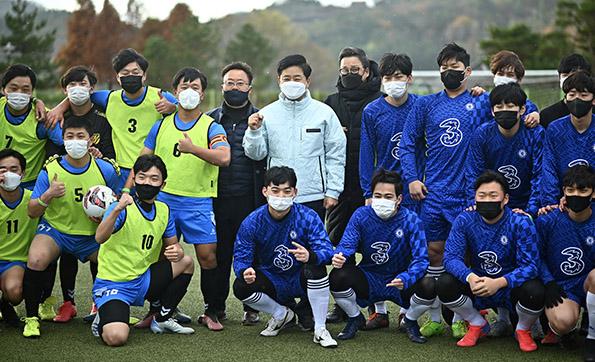 1일 보성에서 열린 전남교육청 고3 학생 축구대회. 장석웅 전남교육감(사진 가운데)이 대회에 참석한 학생들과 기념사진을 찍는 모습. (사진 제공 = 전남교육청)