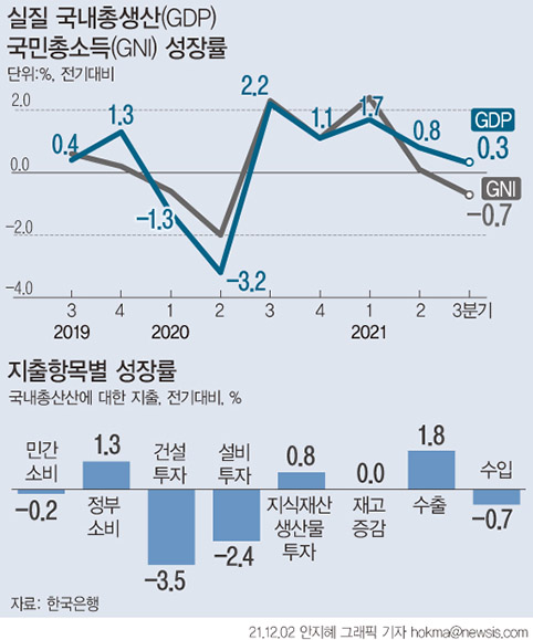 코로나19 4차 유행에 올해 3분기 우리나라의 경제성장률이 0.3%에 그치는 등 속보치와 같은 수준을 유지했다. 실질 국민총소득(GNI)은 470조8000억원으로 전기대비 0.7% 감소했다. 3분기 성장률이 전기대비 크게 둔화된 모습을 보이면서 한국은행이 예상한 연간 4% 성장률 달성에 빨간불이 켜졌다. 한국은행은 코로나19 새 변이바이러스인 '오미크론'의 치명률 등이 4% 달성의 변수로 작용할 것이라고 내다봤다.