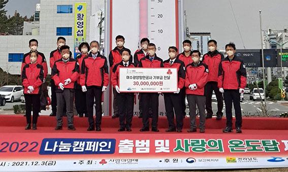 여수광양항만공사(이하 공사)는 지역사회의 복지취약계층과 사회복지시설에 온정을 전하는 ‘희망 2022 나눔캠페인’ 전남동부권 사랑의 온도탑 제막식에 참여, 지난 3일 후원금 3,000만원을 전달했다.