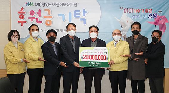 (재)광양시어린이보육재단은 지난 1일 정현복 광양시장, 황재우 보육재단 이사장, 기탁자 등 10여 명이 참석한 가운데 후원금 기탁식을 가졌으며, 조선내화(주)에서 2천만 원의 소중한 후원금을 전달했다.