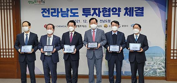 전남도, 광양만권경제자유구역청, 순천시, 광양시와 롯데케미칼(주), 삼박엘에프티(주)는 6일 전남도청 VIP실에서 4500억 원의 대규모 투자협약(MOU)을 체결했다.