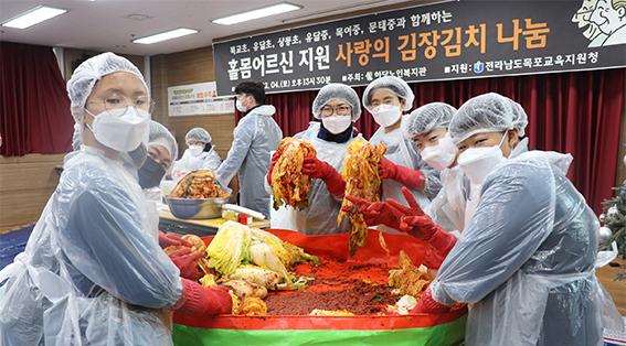전남도목포교육지원청은 지난 4일 같이&가치 교육복지 봉사동아리 학생 30명이 하당이랜드노인복지관에서‘1·3세대 사랑나눔 김장봉사’를 실시했다고 밝혔다.