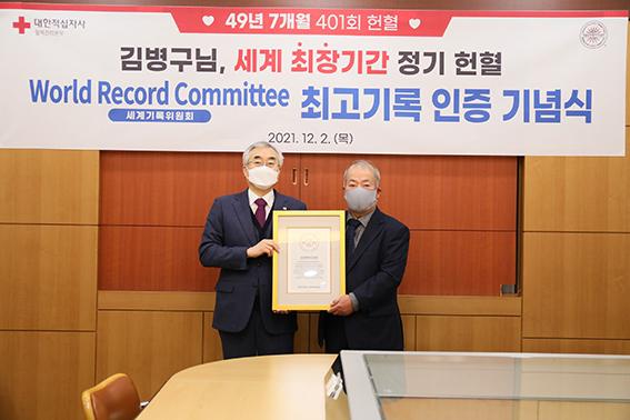 김병구씨는 "우리나라에서 세계 최고 헌혈기록을 보유하게 됐다는 점에서 개인적으로 큰 영광"이라며 "이번 세계기록 인증이 보다 많은 분들로 하여금 헌혈에 참여할 수 있는 본보기로 확산되길 바란다"고 말했다.