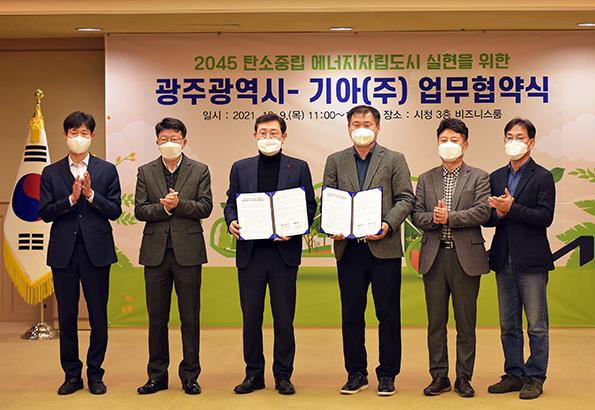 광주시는 9일 시청 비즈니스룸에서 이용섭 시장과 기아 AutoLand 광주 박래석 공장장 등이 참석한 가운데 2045 탄소중립 에너지 자립도시 실현을 위한 업무협약을 체결했다