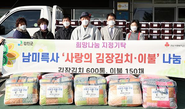 지난 14일 강진군 남미륵사(주지 법흥)에서 어려운 이웃들의 건강한 겨울나기를 위해 강진군에 김장김치 600통과 겨울 이불 150세트를 기탁했다.