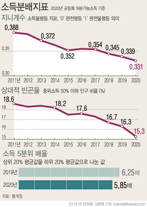지난해 처분가능소득 기준 지니계수는 통계 작성이 시작된 2011년 이후 가장 낮은 수준이다. 처분가능소득 지니계수는 2011년 0.388, 2012년 0.385, 2013년 0.372, 2014년 0.363, 2015년 0.352로 낮아지다가 2016년 0.355로 소폭 상승했다. 이후 2017년 0.354, 2018년 0.345, 2019년 0.339에 이어 지난해까지 4년 연속 하락했다.