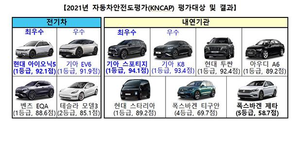 현대 아이오닉5가 전기차 부문, 기아 스포티지가 내연기관차 부문에서 각각 올해 안전도평가 최우수차로 선정됐다.