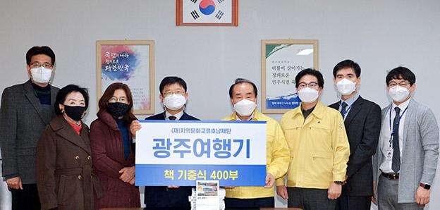 21일 시교육청에 따르면 지역문화교류호남재단은 이 자리에서 광주 역사자원의 지속적 계승 발전을 위한 ‘여행으로 만나는 광주역사문화자원 광주여행기’ 400권을 기증했다. 코로나19 예방을 위해 기증식에는 장휘국 교육감, 광주교대 교수이기도 한 지역문화교류호남재단 김덕진 이사장, 박신영 부이사장, 김정희 편집위원장, 이기훈 상임이사 등 최소한의 인원만 참석했다.