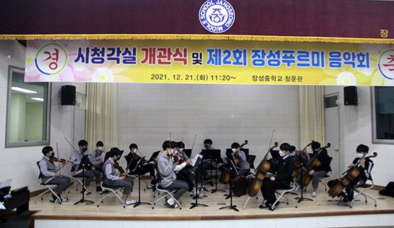 장성중학교에서는 21일 시청각실 개관과‘장성푸르미유스앙상블’의 작은 음악회를 열었다. 행사는 코로나19 방역지침의 강화로 인해 영상 촬영물 공개로 대신했다. 시청각실은 약 500㎡ 면적에 140석을 비치하고 11억 정도가 투입됐으며 ‘청운관’이라는 현판을 달았다.