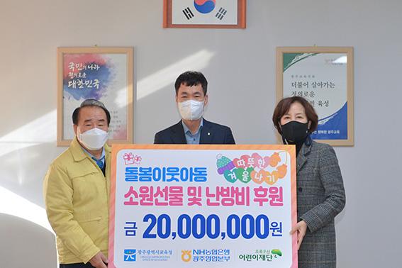 광주시교육청이 23일 ‘산타원정대-자립(긴급사례)지원금’ 2000만 원과 900만 원 상당의 사랑의 김장김치를 NH농협 광주본부로부터 전달받았다.