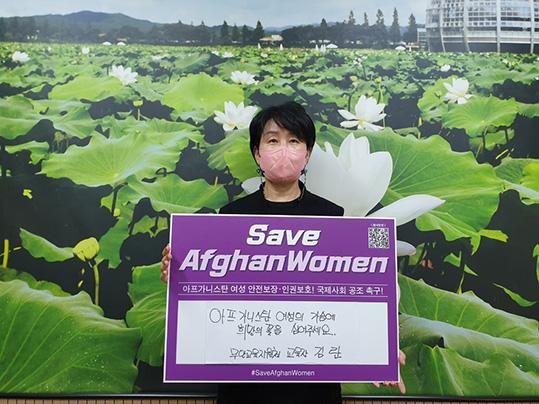 무안교육지원청 김란 교육장은 최근 ‘아프가니스탄 여성의 가슴에 ‘희망의 꽃’을 심어주세요.’라는 손글씨가 적힌 팻말을 들고 ‘세이브 아프간 위민(Save Afghan Women)’ 챌린지에 동참했다.