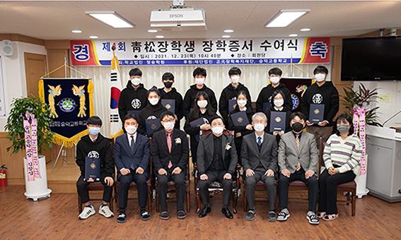 청송 장학금은 지난 11일 치러진 제4회 청송 미래 인재 발굴 장학생 선발 대회에서 입상한 중3 학생들에게 전달됐다. 대상 1명에게 300만 원, 최우수상 2명에게 총 400만 원, 우수상 10명에게 총 500만 원이 지급됐다.