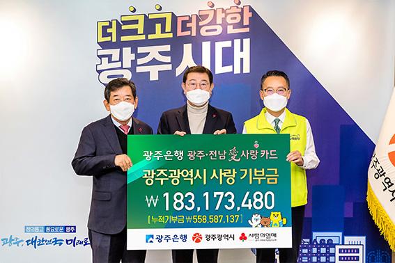 광주은행은 23일 광주시청에서 송종욱 광주은행장과 이용섭 광주시장, 한상원 광주사회복지공동모금회 회장 등이 참석한 가운데 ‘광주·전남愛사랑카드’ 기부금 전달식을 가졌다. 전달액은 1억8317만3480원이다.