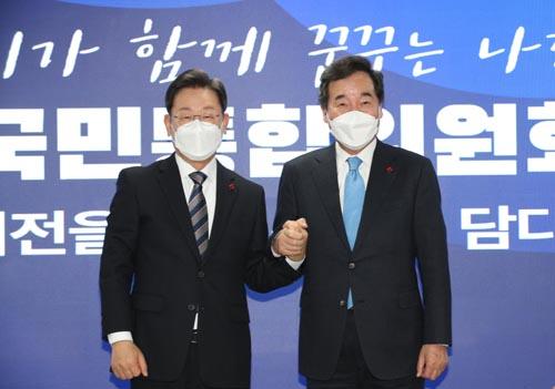 이재명 더불어민주당 대선 후보와 이낙연 전 대표가 27일 국가비전·국민통합위원회(비전위) 출범을 갖고 대선 승리를 위한 단결과 국민 통합, 미래 비전 제시에 뜻을 모았다. 당내 경선에서 맞붙었던 두 사람은 지난 23일 회동 이후 비전위 공동위원장 직을 맡기로 한 바 있다.