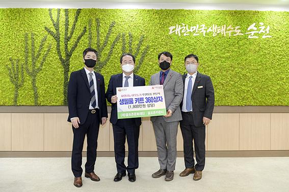 (재)골프존문화재단과 골프존카운티는 희망2022나눔캠페인에 참여하기 위해 1800만원 상당의 생필품 꾸러미 360상자를 순천시에 기탁했다.