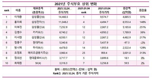 그의 보유지분 가치는 14조4603억원으로, 연초 대비 51%(4조8855억원) 증가했다. 고 이건희 회장으로부터 받은 상속 지분 증가에 따른 것이다. 2위도 홍라희 전 리움미술관장(11조482억원)이 이름을 올렸다. 이부진 호텔신라 사장(7조2529억원)과 이서현 삼성복지재단 이사장(6조5501억원)도 연초 공동 12위에서 연말 각각 3위와 5위로 뛰었다.