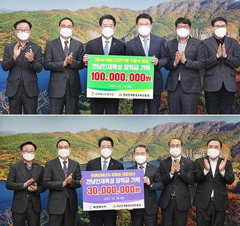전남인재평생교육진흥원은 28일 녹색에너지연구원과 해양에너지가 각각 1억원, 3000만원의 장학금을 기탁했다고 밝혔다.