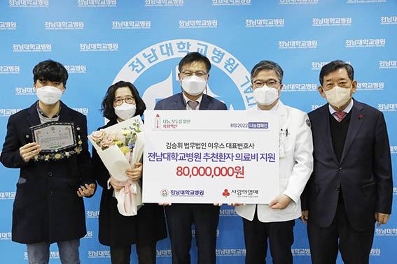 법무법인 이우스 김승휘 대표변호사가 24일 전남대학교병원의 저소득계층 환자 진료비 지원을 위한 기부금 8000만원을 기탁했다.
