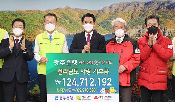 기탁 받은 성금은 ‘광주·전남愛 사랑카드’ 사용 시 적립된 ‘고향사랑기금’으로 마련됐다. 전남사회복지공동모금회를 통해 22개 시군 취약계층에 지원할 예정이다.