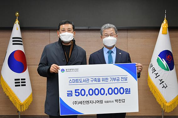 광주 서구가 ㈜세진엔지니어링으로부터 지난 29일 스마트도서관 구축을 위한 기부금 5천만원을 기탁받았다고 밝혔다.