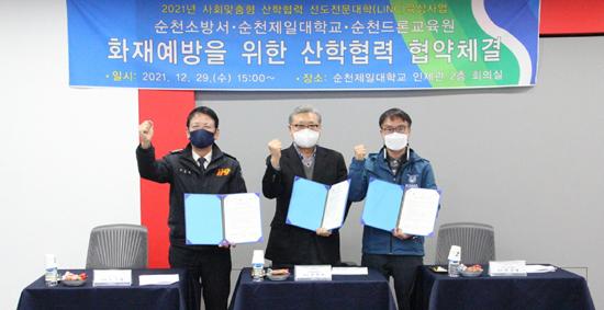 순천소방서가 순천제일대, 순천드론교육원과 지속적인 논의 끝에 산학협력 업무협약을 체결했다.