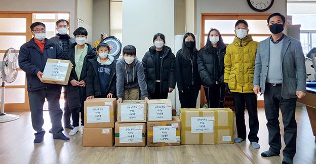 마량초등학교 학생들과 교사가 지난달 29일 마량면사무소에 경로당에 전달해달라며 지팡이와 핫팩, 귀마개 등 겨울용품을 기부했다.