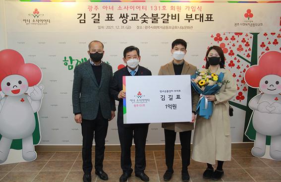 광주사회복지공동모금회는 올해 마지막 날인 31일 김길표 쌍교숯불갈비 부대표가 1억원 이상 성금을 기부한 개인고액기부자 모임인 '아너 소사이어티'에 가입, 광주 131호 회원이 됐다고 밝혔다.