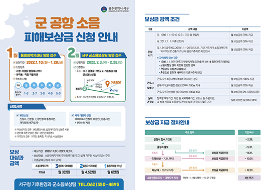 광주 서구는 오는 10일부터 다음달 28일까지 소음대책 지역민의 군(軍) 소음 피해보상금 접수를 시작한다고 4일 밝혔다.
