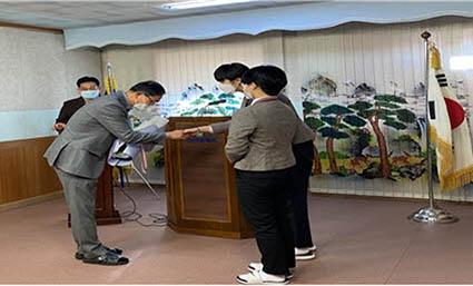 취임식은 코로나19로 최소인원과 간소한 식순 속에 대면 및 비대면으로 진행했으며, 학교법인 도연학원 조일근 이사, 정운 이사, 학교운영위원회 위원장, 교직원 등이 참석했다.