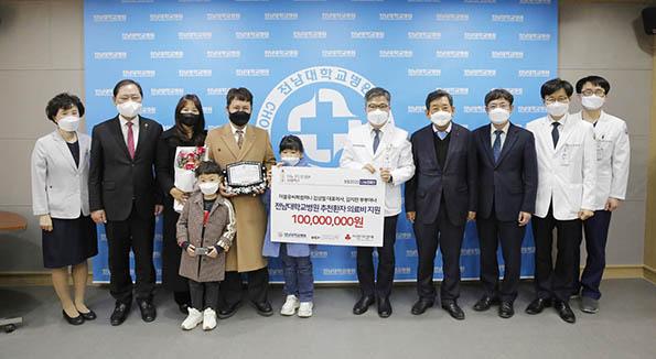 김 대표 부부가 기탁한 기부금은 전남대병원에서 치료 중인 저소득 환자들의 의료비로 사용될 예정이다.