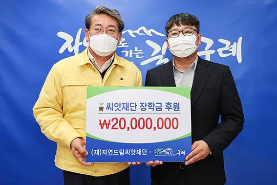 구례군은 (재)자연드림씨앗재단에서 지원하는 2021년 하반기 장학금 전달식을 6일 구례군청 군수실에서 구례자연드림파크입주자 협의회 오성수 대표가 참석한 가운데 가졌다.