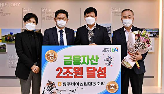 광주비아농협은 2019년에 예수금 1조원 달성탑을 수상했다. 고객자산 보호와 서민금융지원으로 지역경제 활성화에 최선을 다해 2021년에는 금융자산 2조원을달성, 금융자산 2조원 달성탑을 수상했다.