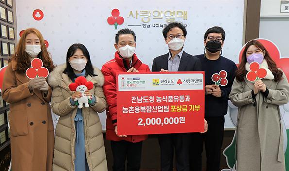 전남도는 농식품유통과 농촌융복합산업팀 직원들이 지난해 성과로 받은 상금 200만원을 사회복지공동모금회에 전달했다고 11일 밝혔다.