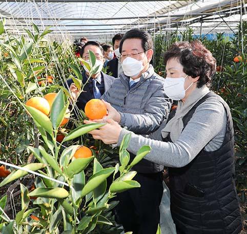 또한, 소득작목을 발굴 중인 실증시험포에서 지역특화작목을 개발 중인 관계자들을 격려하고, 한라봉과 천혜향을 재배하는 아열대과수 농가(봉강면 이동배)를 방문해 재배 현장을 직접 찾아 노고를 격려하며 경쟁력 강화방안에 대한 의견을 수렴했다.