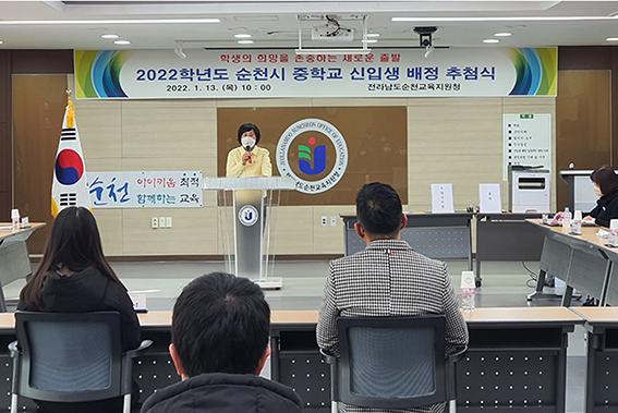 순천교육지원청은 지난 13일 순천교육청 대회의실에서 학생, 학부모를 비롯한 순천관내 교육가족이 참석한 가운데 ‘2022학년도 순천시 중학교 신입생 배정 추첨식’을 개최했다.