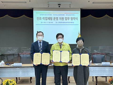 광주동부교육지원청은 17일 지원청 대회의실에서 지식서비스산업전문진흥원·광주상생일자리재단과 청소년 진로·직업체험 프로그램 개발 및 운영을 위한 업무 협약을 체결했다.