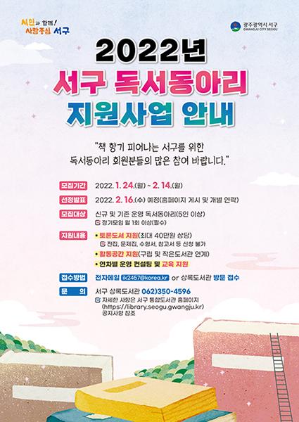 광주 서구가 지역 주민의 독서 생활의 기반이 되는 ‘2022년 독서동아리 지원 사업’ 참여 동아리를 오는 24일부터 모집한다고 밝혔다.