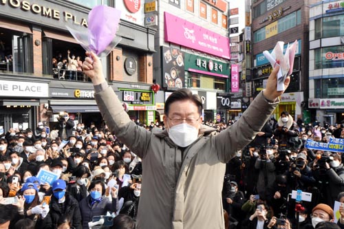 이재명 더불어민주당 대선 후보가 23일 오전 경기 수원시 매산로 테마거리에서 열린 '매타버스' 수원, 민심속으로! 행사에 참석해 지지자들에게 손을 흔들고 있다.