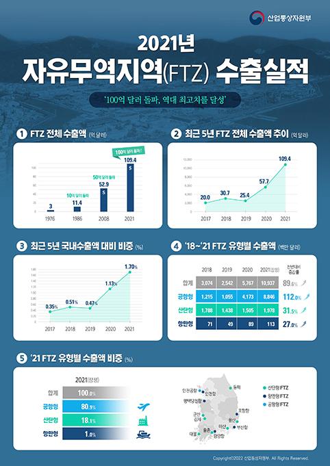 정부는 현재 13개 자유무역지역을 지정·운영하고 있다. 산단형 7곳, 항만형 5곳, 공항형 1곳 등이다. 자유무역지역 수출액은 1976년 처음 3억 달러를 넘어섰으며 1986년(11억4000만 달러) 10억 달러를 달성했다. 이후 2008년(52억9000만 달러) 50억 달러를 돌파한 지 13년 만에 100억 달러를 넘겼다.