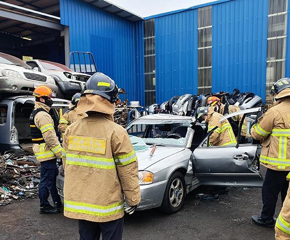 주요 훈련내용은 ▲사고차량 문 개방과 유리파괴 ▲에어백과 유압장비를 활용한 인명구조 ▲요구조자 부목고정 등 응급처치 ▲질식 소화포 활용 전기자동차 화재진압 방법 숙달 등이다.