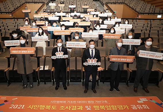 이날 공유회에서는 2021년 시민행복도 조사를 토대로 행복정책 실시 이후 시민의 만족도, 행복감에 대한 분석 결과가 발표됐다.